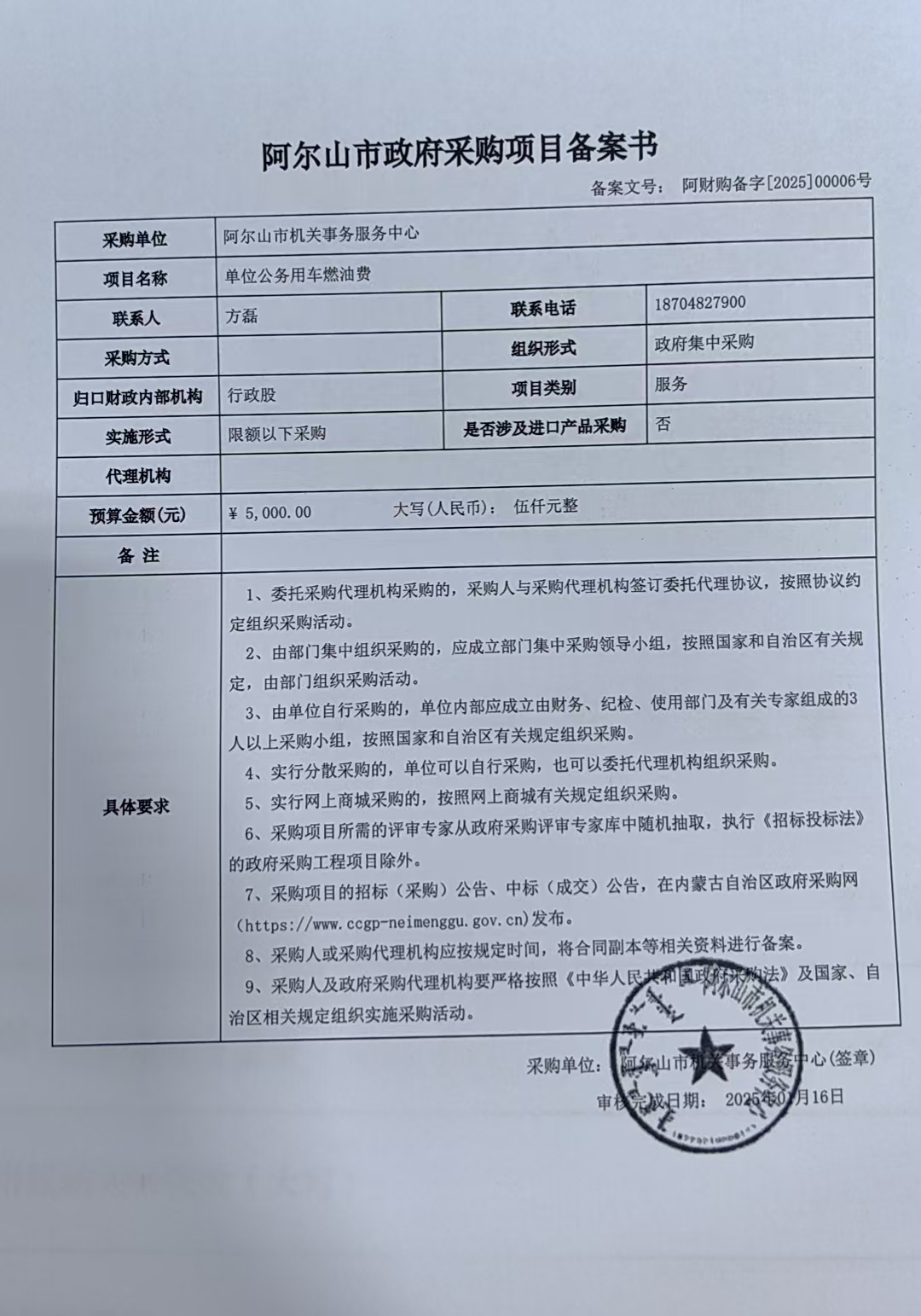 阿尔山市机关事务服务中心单位公务用车燃油费政府采购合同公告