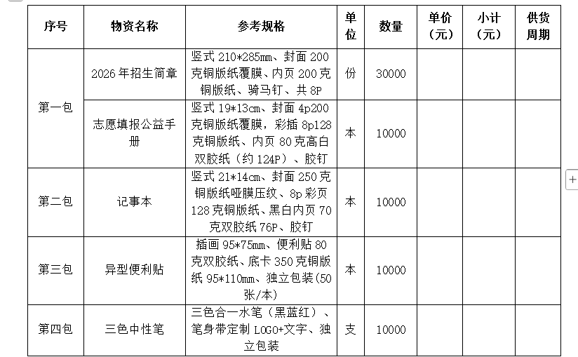 ******学院2026年寒假招生宣传物料采购项目进行公开询价,欢迎符合条件的供应商积极参与。